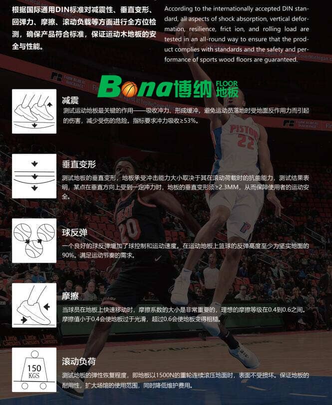 博納地板產(chǎn)品及服務(wù)符合1/2/3級(jí)賽事工程標(biāo)準(zhǔn),運(yùn)動(dòng)木地板的專業(yè)檢測(cè)符合通用的DIN標(biāo)準(zhǔn):